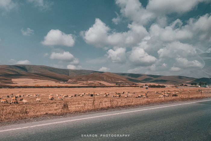 离开门源,我们驶向了祁连大草原,开车行驶在祁连山的公路上,看着两旁由草原、山景、蓝天、湖泊组成的大型画卷。此时,车内响彻的尽是怀旧老歌,看来80后的北京大叔有股古早情怀,我们也跟着一起怀旧着,点着回忆青春的歌曲。尽管秋天已至,略有泛黄,但不影响欣赏到“风吹草地见牛羊”的壮阔草原全景,让人迷醉。
