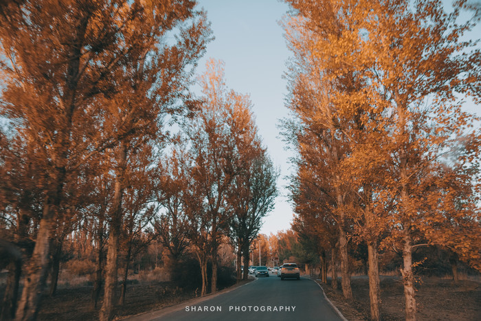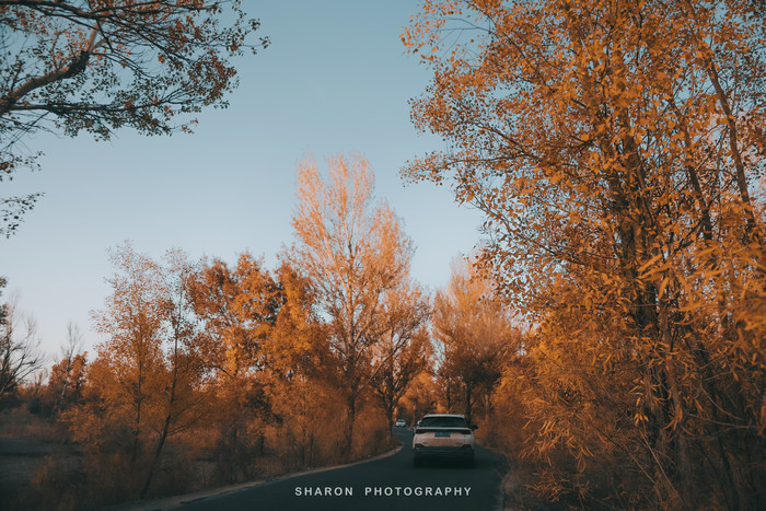 或许是因为假期,又逢赏秋旺季,离大门远远的就排起车队,眼看日头即将下山,缓慢驶入。金塔胡杨林真的好大,茂密的胡杨千奇百怪,神态万般,尤其是行驶在高大的胡杨林道路上,秋风乍起,浅绿、淡黄的叶片闪现,错落有致,亲像行驶在仙境一般。