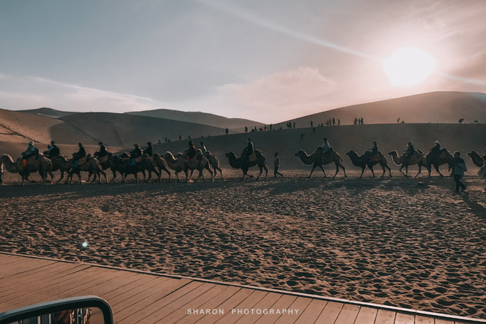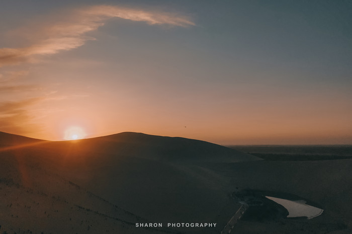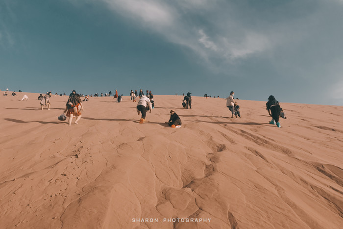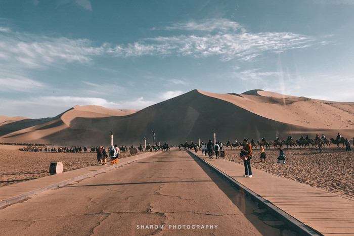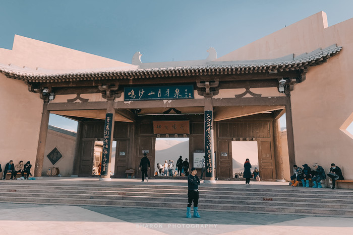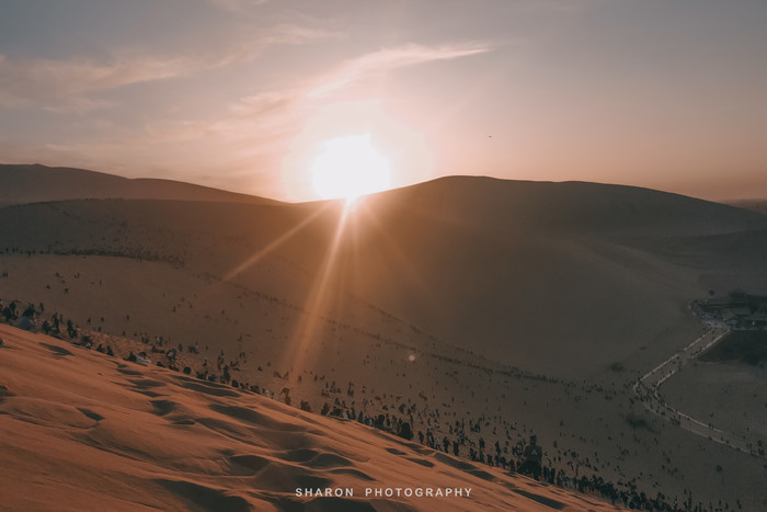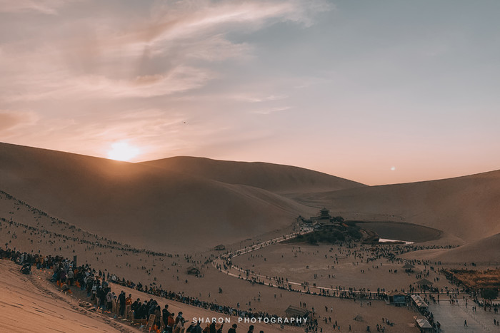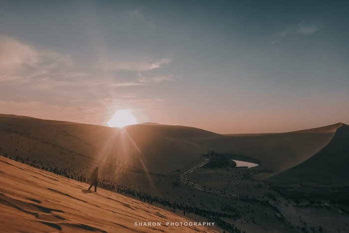 鸣沙山的沙子十分细腻,爬沙山是一项体力活,攀爬至山顶至少需要1个多小时。“沙挟风而飞响,泉映月而无尘”,爬至中段便可一睹不远处的月牙泉奇景。而我的能力只能止于此了,一个人孤独地忘了月牙泉等待爬上沙山顶部的小伙伴的日落照。