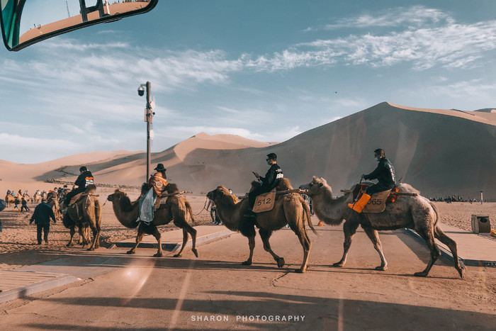到达鸣沙山月牙泉,确实惊呆了,偌大的景区仍然是人满为患,原本以为骑骆驼的线路从景区门口翻过沙山走到月牙泉附近,但可能由于是国庆高峰期,只看到骆驼饶了沙山一圈。而ATV则只能在沙山周围行驶,电瓶车仅仅只是从入口送到沙山脚下,但是不管是哪个队伍拢排得特别的长。