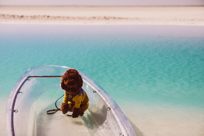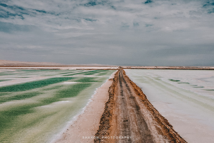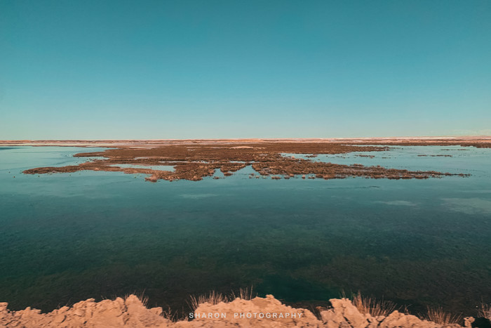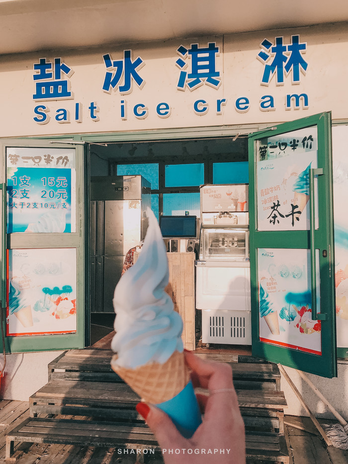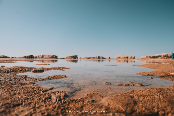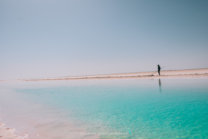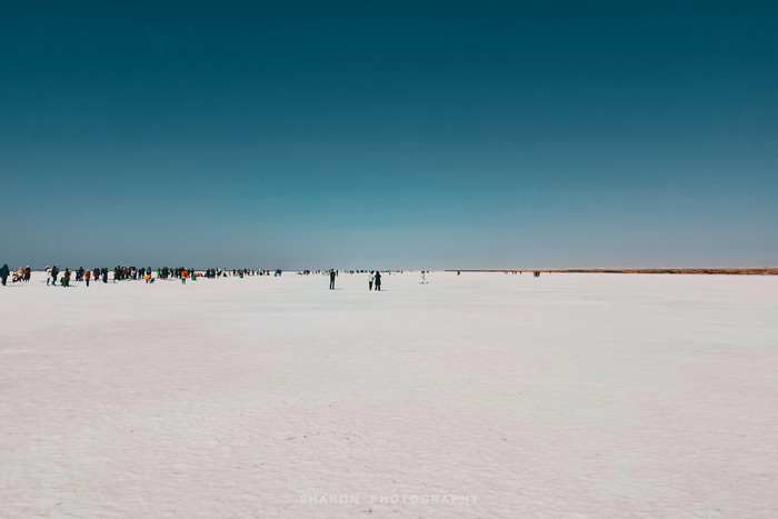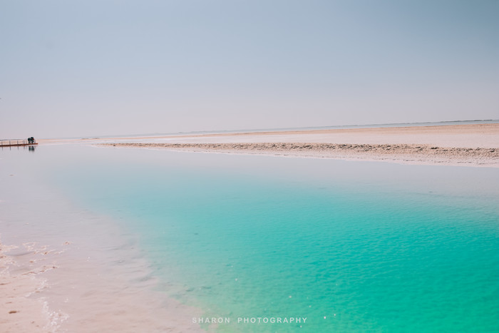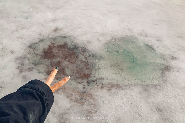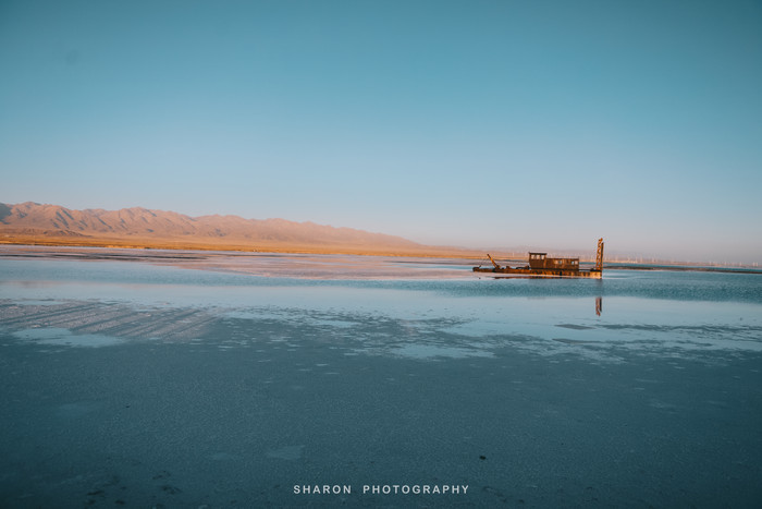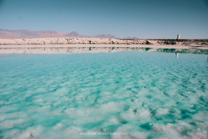 随后,抵达东台吉乃河湖,这里和西台不一样,是一个以卤水为主的大型锂矿床,隐藏在雅丹地貌中,经过大片盐地,远远便可望见一抹蔚蓝。网上看到的网红图片便是通过无人机拍摄的,原以为那是湖中穿行的G315的西台,却不知东台也有一条小路穿梭其中,但是我们仅能在湖的这一侧欣赏。湖边厚厚盐层近看并无特色,却成为我好奇关注的重点,倒是清澈透明的湖水不论远近拢格外亮眼,还有网红透明船供游客拍照。