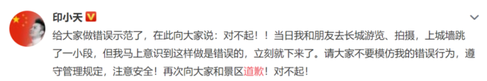 8月1日下午,印小天发文为自己在长城上跳舞道歉。