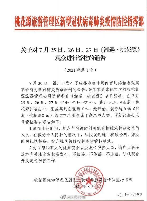 8月1日,湖南常德桃花源旅游管理区疫情防控指挥部发布公告:7月30日,银川市发布了成都市确诊病例密切接触者张某某诊断为确诊病例的公告,张某某系常德市文旅投桃花源旅游管理公司运营项目《湘遇·桃花源》节目编导,在7月25日、26日、27日(14:00/15:00/21:00,共计9场)《湘遇·桃花源》演出中,张某某均在现场工作。经评估,观看这9场《湘遇·桃花源》演出的777名观众属于高风险人群。请在上述时间、地点与确诊病例可能有接触或轨迹交叉的人员,在做好个人防护的情况下,尽快就近进行核酸检测,并及时向社区报备,配合社区做好相关疫情管控措施。