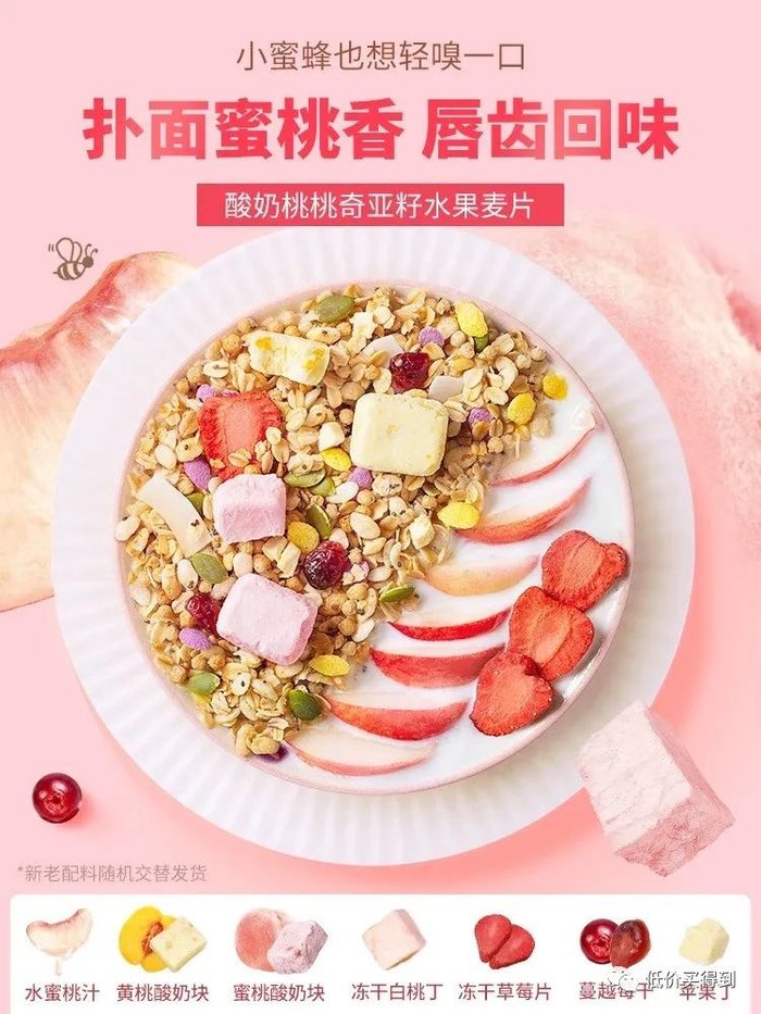 网红麦片之一,里面有蜜桃味的麦片,加上酸奶块和冻干白桃丁、草莓块、椰子片、蔓越莓干等等,还有饱腹感极强的奇亚籽,口感很丰富!