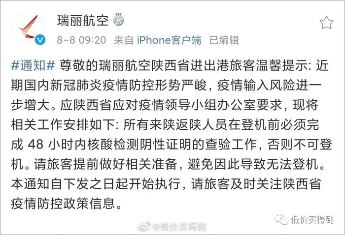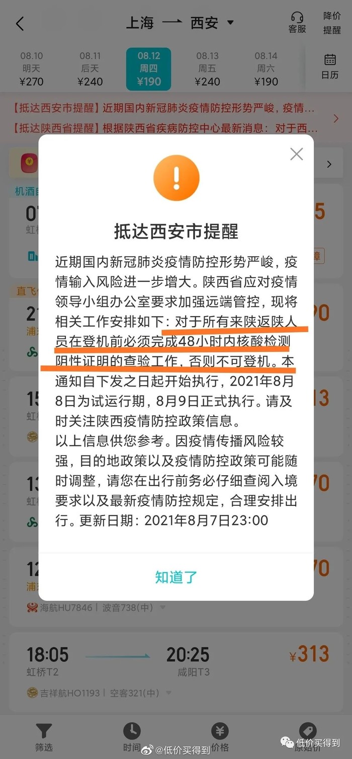从8月9日起,所有外省乘机返陕来陕人员,登机前必须提供48小时内核酸检测阴性证明,否则不可登机。