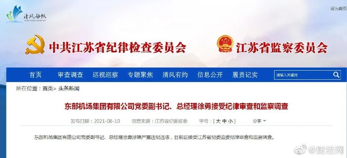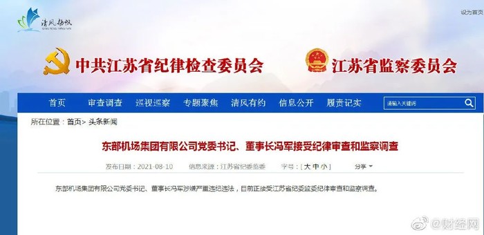 8月10日,江苏省纪委监委消息,东部机场集团有限公司党委书记、董事长冯军和党委副书记、总经理徐勇“双双被查”。