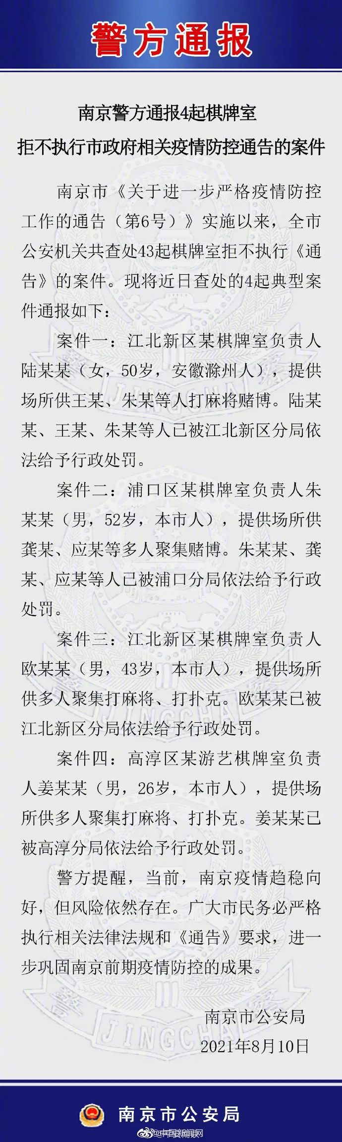 10日,@平安南京 消息,南京警方通报4起棋牌室拒不执行市政府相关疫情防控通告的案件,通报如下:
