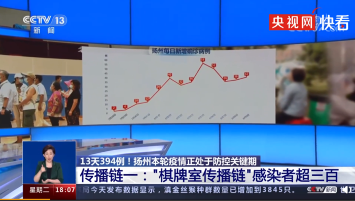 扬州13天新增394例,疫情的源头来自于棋牌室。此前,据江苏卫健委健委通报,扬州这次传播的病毒是德尔塔,病毒载量高、传播速度快;扬州1号确诊病例(之前有详情介绍,点这里查看>>>),7月21日从南京高风险地区前往扬州亲戚家中,此后7天时间该病例频繁活动在扬州棋牌室等人员高度密集场所,造成病毒传播。据不完全统计,这条“棋牌室传播链” 的感染者已经有三百多人。这让扬州的疫情形势变得严峻复杂。