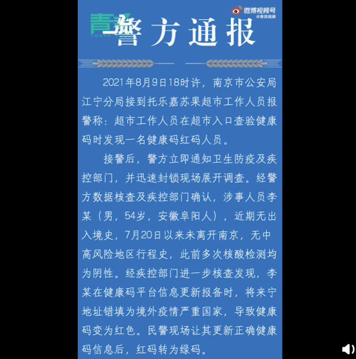 8月9日,网上出现南京一名“红码”人员进了超市,且从未做过核酸检测,引得大家纷纷猜测。南京市公安局江宁分局8月10日凌晨发布通报,涉事人员李某在健康码平台信息更新报备时,将地址错填为境外疫情严重国家,导致健康码变为红色。经现场更新正确健康码信息后,红码转为绿码。李某近期无出入境史,7月20日以来未离开南京,此前多次核酸检测均为阴性。