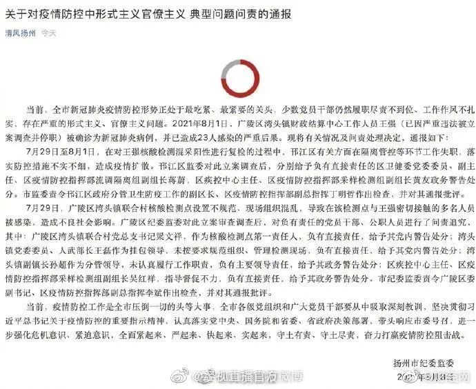 江苏省扬州市纪委监委8日发布通报,当地有核酸检测点出现交叉感染,广陵区湾头镇、邗江区多名干部因疫情防控不力被问责。