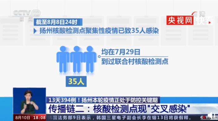 据扬州官方公布的病例轨迹显示,截至8月8日24时,扬州广陵区湾头镇联合村核酸检测点聚集性疫情已致35人感染,35人均在7月29日晚到过联合村核酸检测点,或采样,或工作。此外,这35例感染者中有34人是扬州通报的38号确诊病例的密接,还有1人是267号确诊病例的密接,267号病例也在7月29日晚上去过湾头镇联合村核酸检测点,也是38号确诊病例的密接,这也表明,该核酸检测点已出现三代传播。