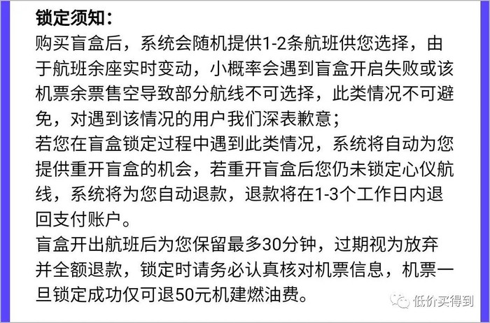 购买盲盒后,会随机提供1-2条航班供选择,没有想锁定的航线,系统会自动全额退款。