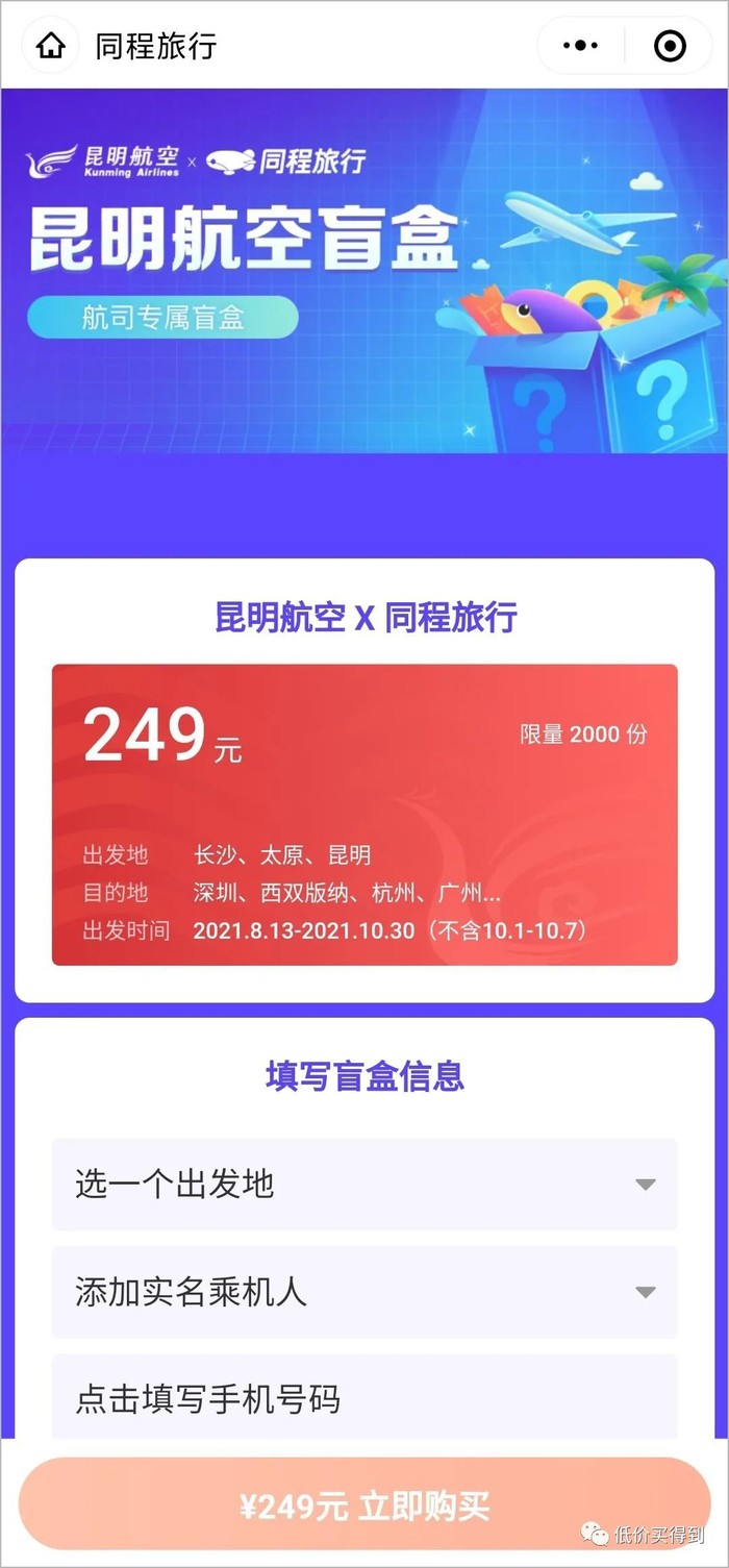 售价249元,包含50元机建燃油费用,昆明航空单程机票盲盒,可选昆明、长沙、太原出发,目的地随机。