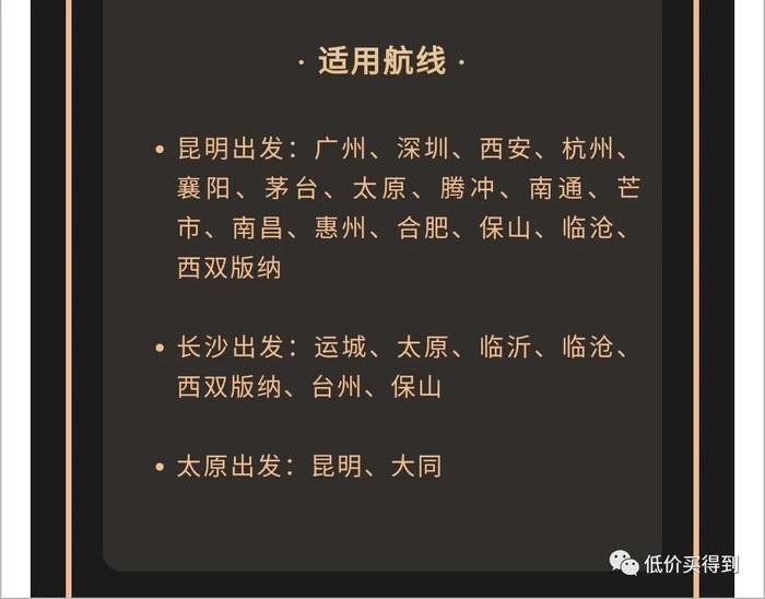 适用航线:目前只能选择昆明、长沙、太原出发,有可能随机的分配的目的地如下。