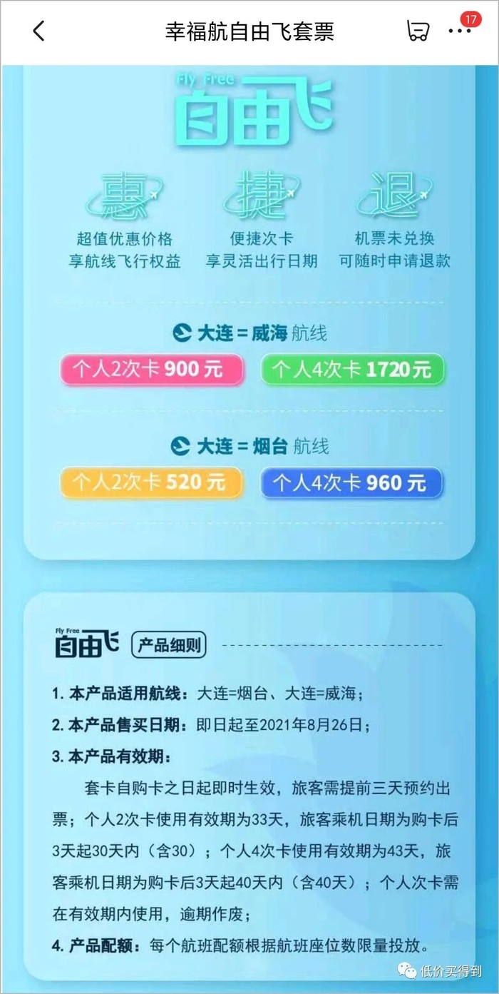 航线:大连=威海、大连=烟台,分别有2次卡、4次卡可选。