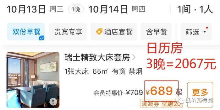 日历房3晚需2067元,套餐3晚仅1665元,便宜了402元,妥妥8折优惠!