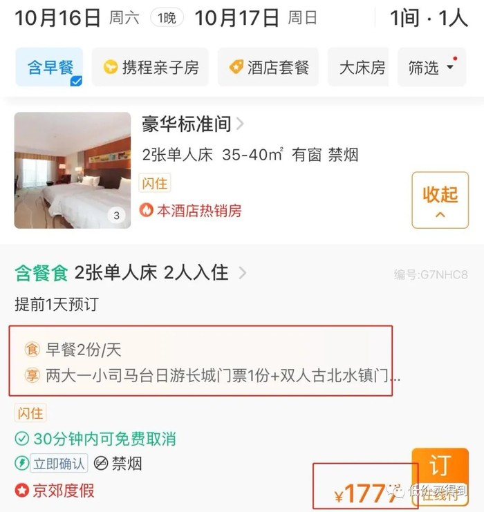 目前周末入住的话,日历房可预订的含门票、温泉等一晚需1777元,套餐一晚1599元(加价后),便宜了178元。
