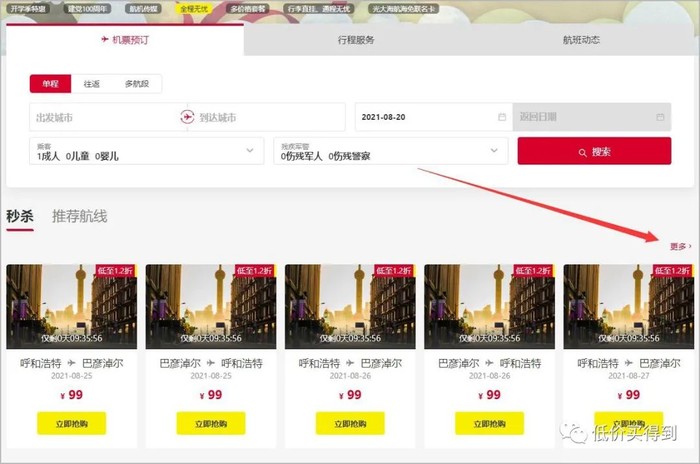 等秒杀快开始的时候,就能在页面上看到这个秒杀模块了,先登录天津航空会员之后,点击“更多”,就能看到全部秒杀机票。