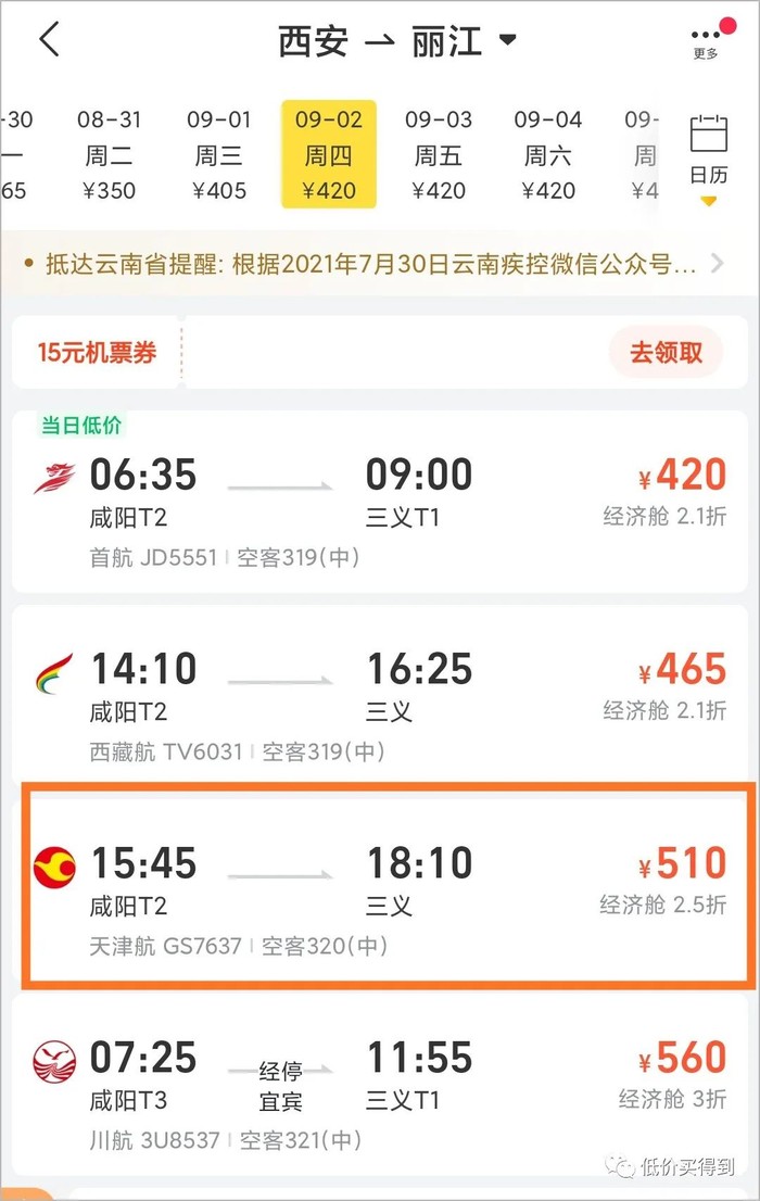 西安飞丽江单程,9.2出发,秒杀价249元,航班时间也很好,下午15:45西安出发,18:10到达丽江。