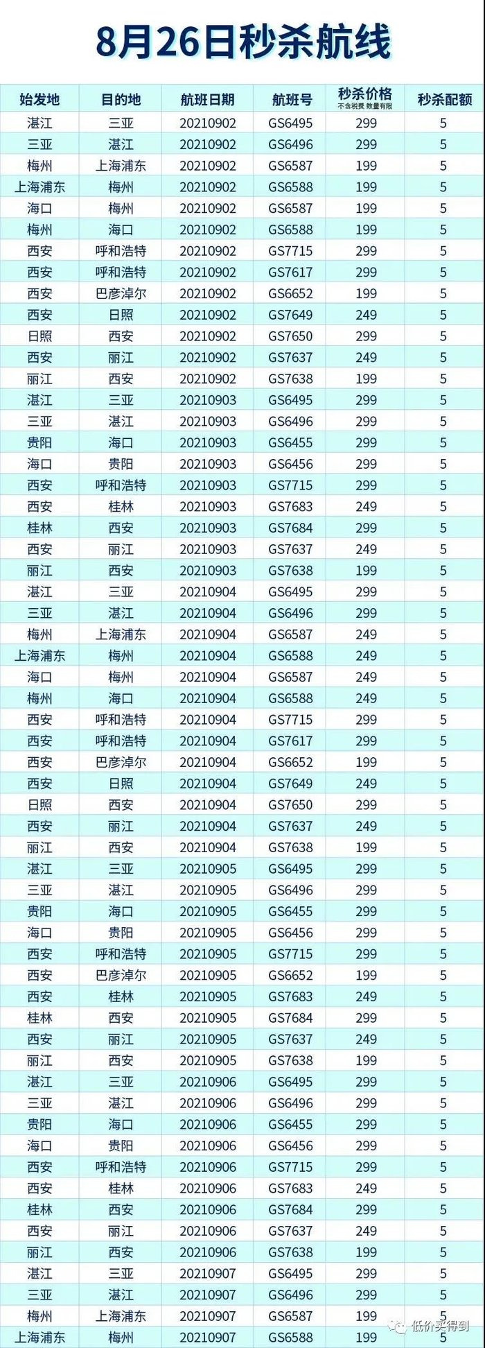 9.2-9.7,具体航线、航班日期、航班号、秒杀价格、秒杀数量如下:
