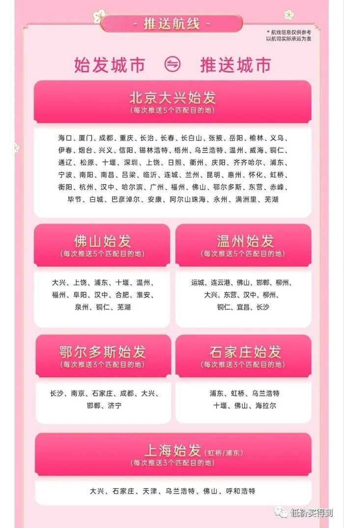 可选这6个城市出发:北京、上海、佛山、石家庄、温州、鄂尔多斯。可能推送这些航线: