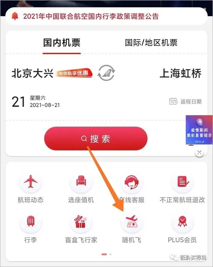 中国联合航空APP首页-随机飞。PS:其实“随机飞”一直在销售,价格会有波动,估计一直卖到年底。
