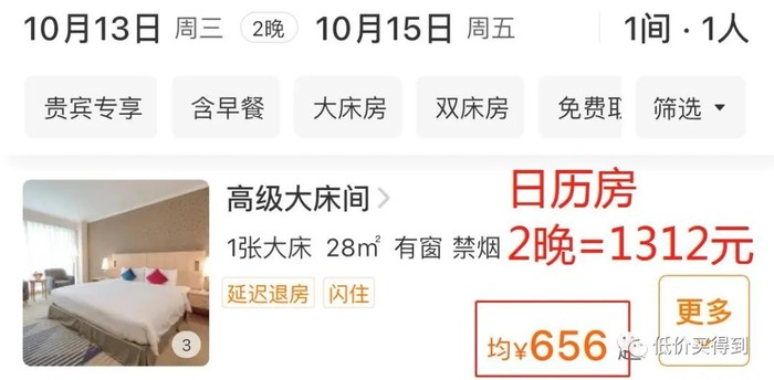 日历房2晚需1312元,套餐2晚仅888元,便宜了424元,约等于6.5折。