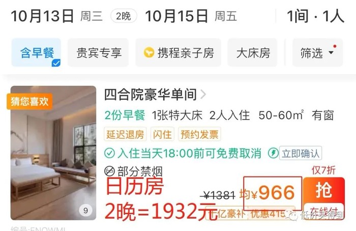 日历房2晚需1932元,套餐2晚仅1180元,便宜了752元,近乎6折的优惠!
