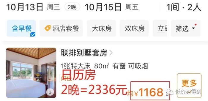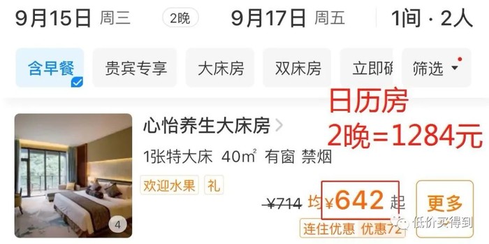日历房2晚需1284元,套餐2晚仅999元,便宜了285元,打了7.7折!