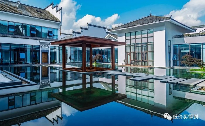 酒店整体是典型的徽派建筑风格,再融入了现代简约风,一步一景,就像住进了画卷里。