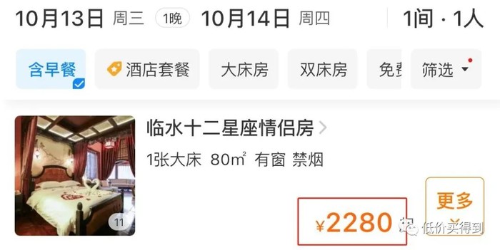 日历房一晚需2280元,套餐一晚仅1399元,便宜了881元,接近6折的优惠!