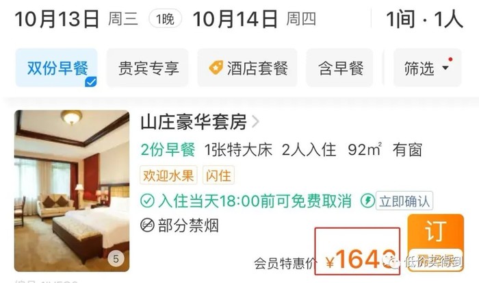 日历房一晚需1643元,套餐一晚仅1199元,便宜了444元。