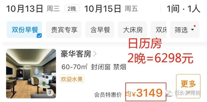 日历房2晚需6298元,套餐2晚仅3999元,直降2299元,直接打了6.3折,太值了!