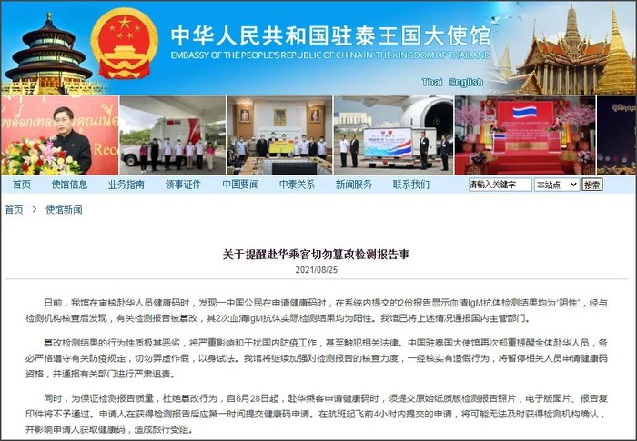 根据中国驻泰国大使馆最新消息,日前,中国驻泰国大使馆在审核赴华人员健康码时,发现一中国公民在申请健康码时,在系统内提交的2份报告显示血清IgM抗体检测结果均为“阴性”,经与检测机构核查后发现,有关检测报告被篡改,其2次血清IgM抗体实际检测结果均为阳性。中国驻泰国大使馆已将上述情况通报国内主管部门。