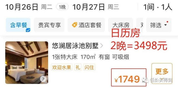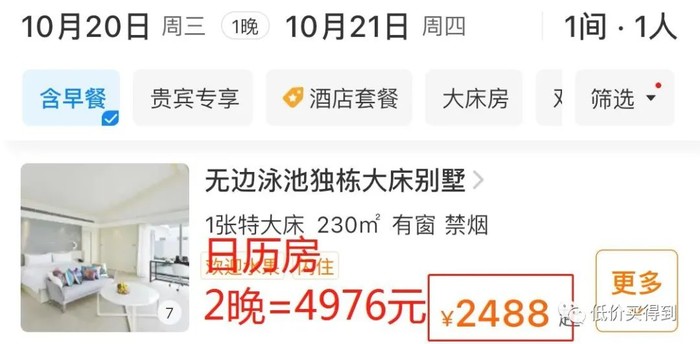 平时预订2晚需3498元,套餐2晚仅2388元,便宜了1110元,打了6.8折。