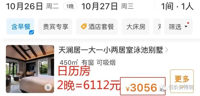 平时预订2晚需6112元,套餐2晚仅3999元 ,便宜了2113元,妥妥的6.5折!