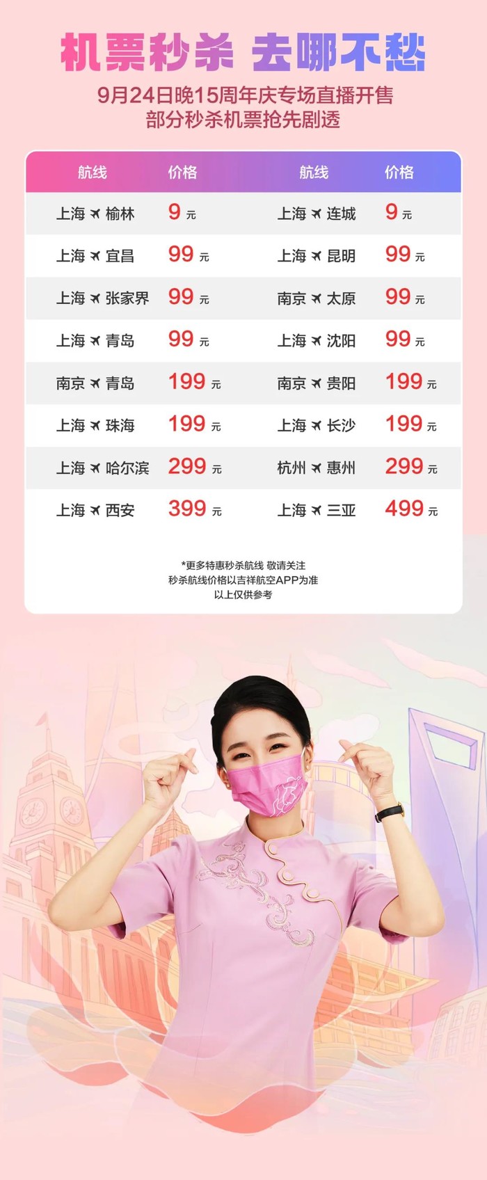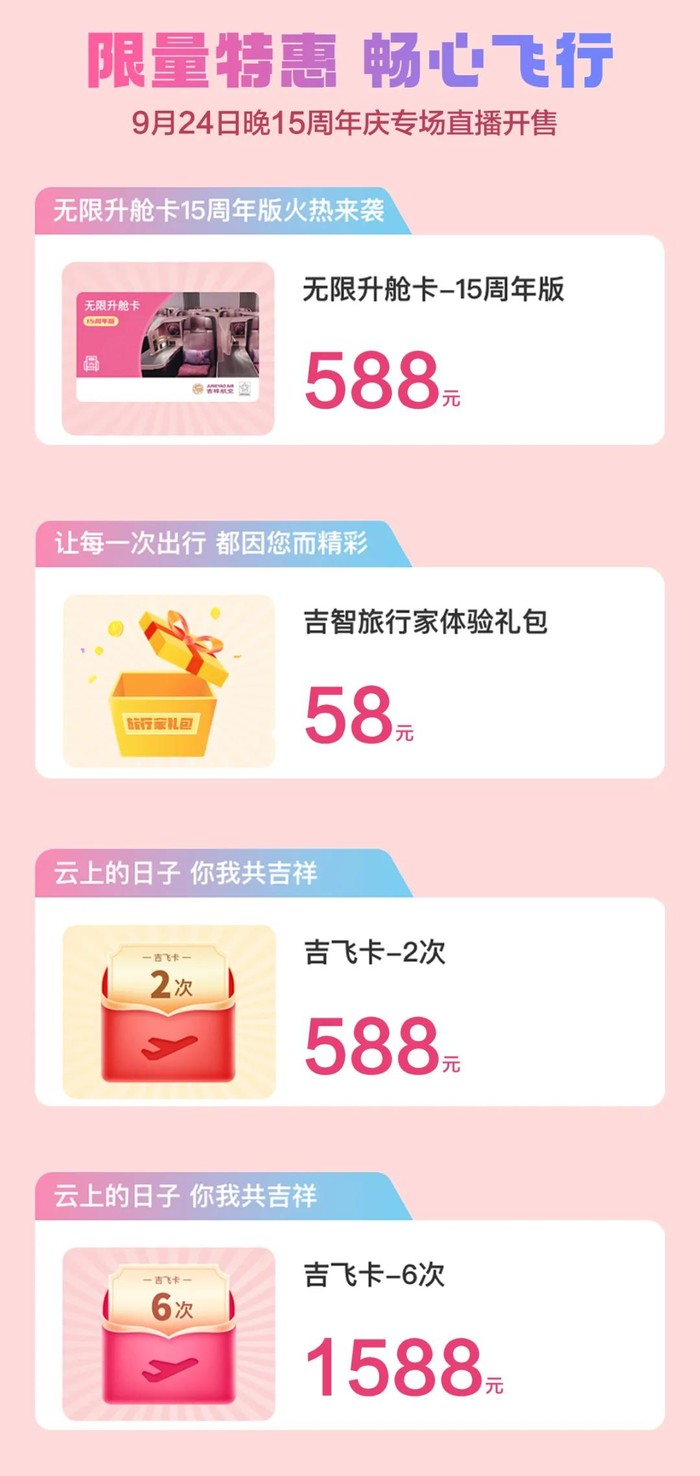 吉祥航空15周年庆,9月24日 18:30吉祥航空直播间,将有飞行次卡(588元飞2次,1588元飞6次),588元无限升舱卡,9元/99元/199元特价机票秒杀。
