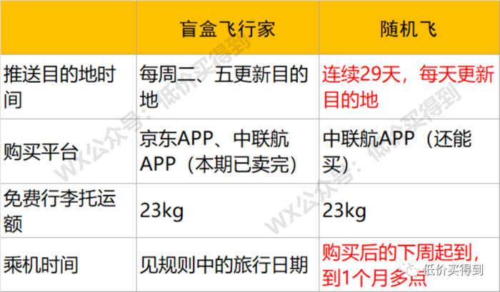 “盲盒飞行家”和“随机飞”都是中联航的盲盒产品,两者可选出发地一样,目的地都是随机推送。