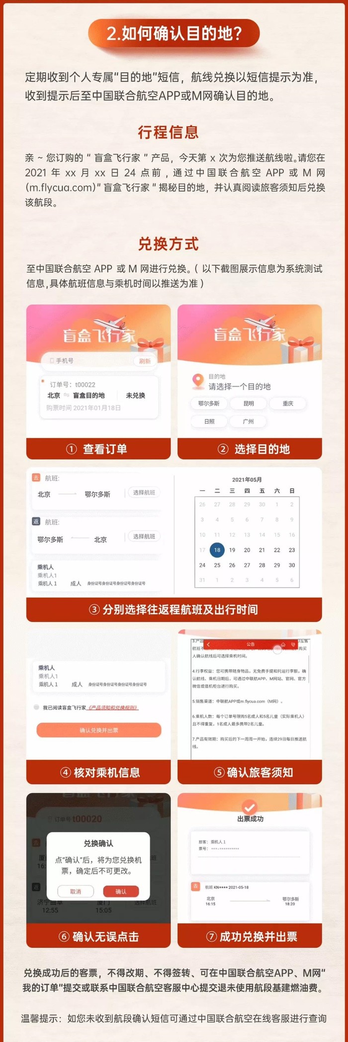 到了推送目的地的日期,你会收到短信,然后前往“中国联合航空APP-盲盒飞行家页面”兑换机票。