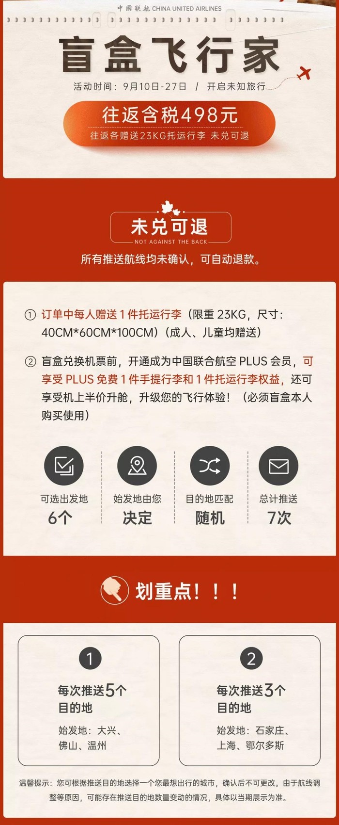 中国联合航空的“盲盒飞行家”机票盲盒回归,含税498元/人,可兑换往返机票一套,含23kg行李,未用可退,出发地自选,目的地随机推送,看到合适的航线就可以兑票。