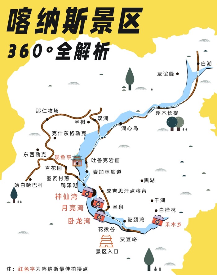 各景点的位置分布图可参考下图,中间的喀纳斯湖/河是核心,图片来源于番友。