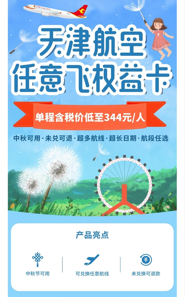 天津航空688元任意飞权益卡(价格已含税),可兑换1套往返机票,航段任选,中秋可用,未兑票可退款。