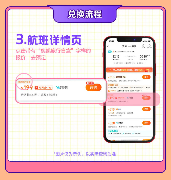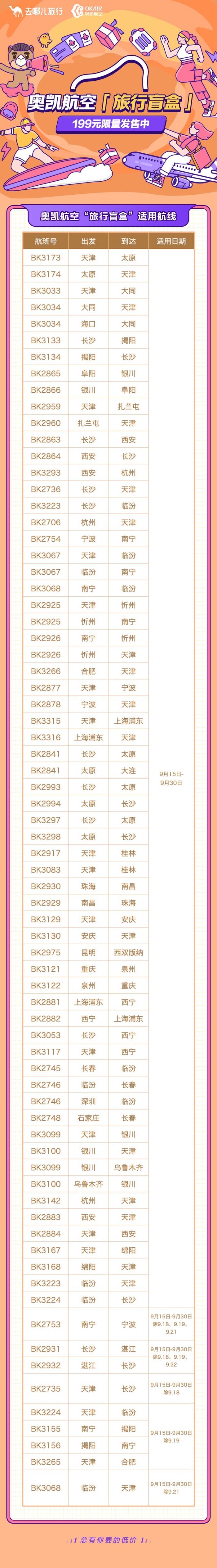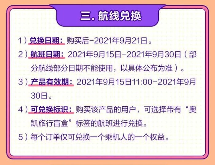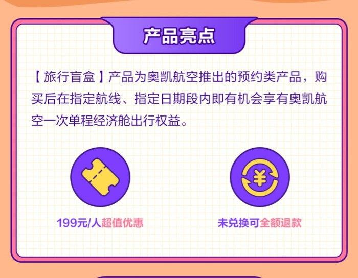 奥凯航空旅行盲盒,199元买一个盲盒,可从指定航线范围中,选一条兑换机票1张,50元税费另付,每个用户最多买5张。未兑票,可于9.30之前全额退款。