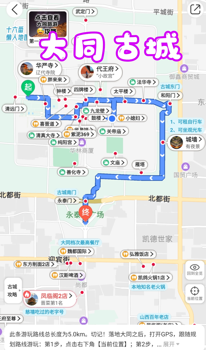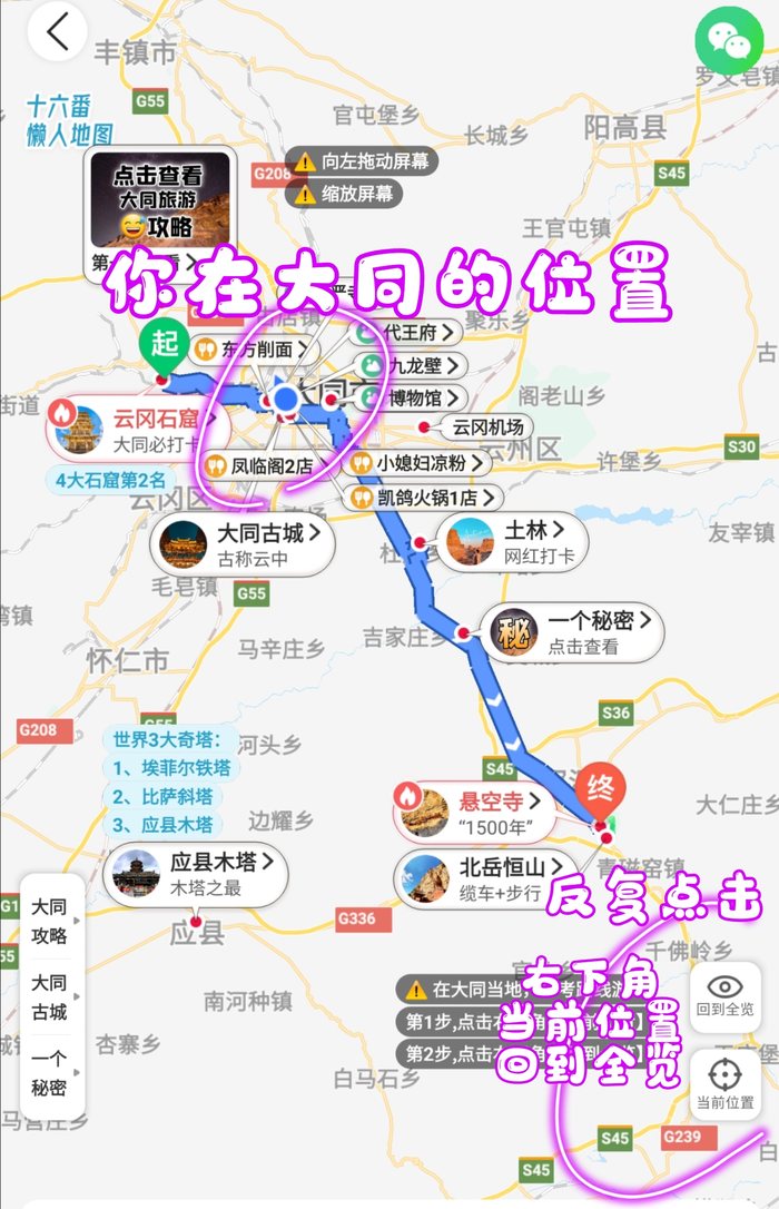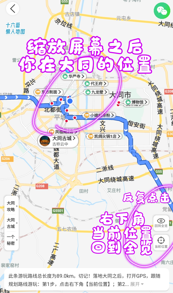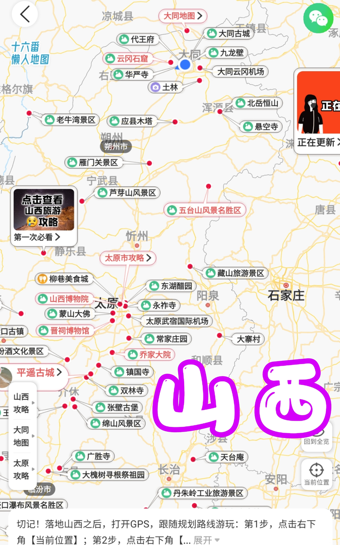 第2步:点击右下角“当前位置”,显示你在“大同”的位置。