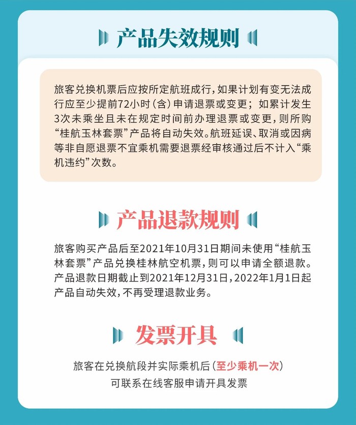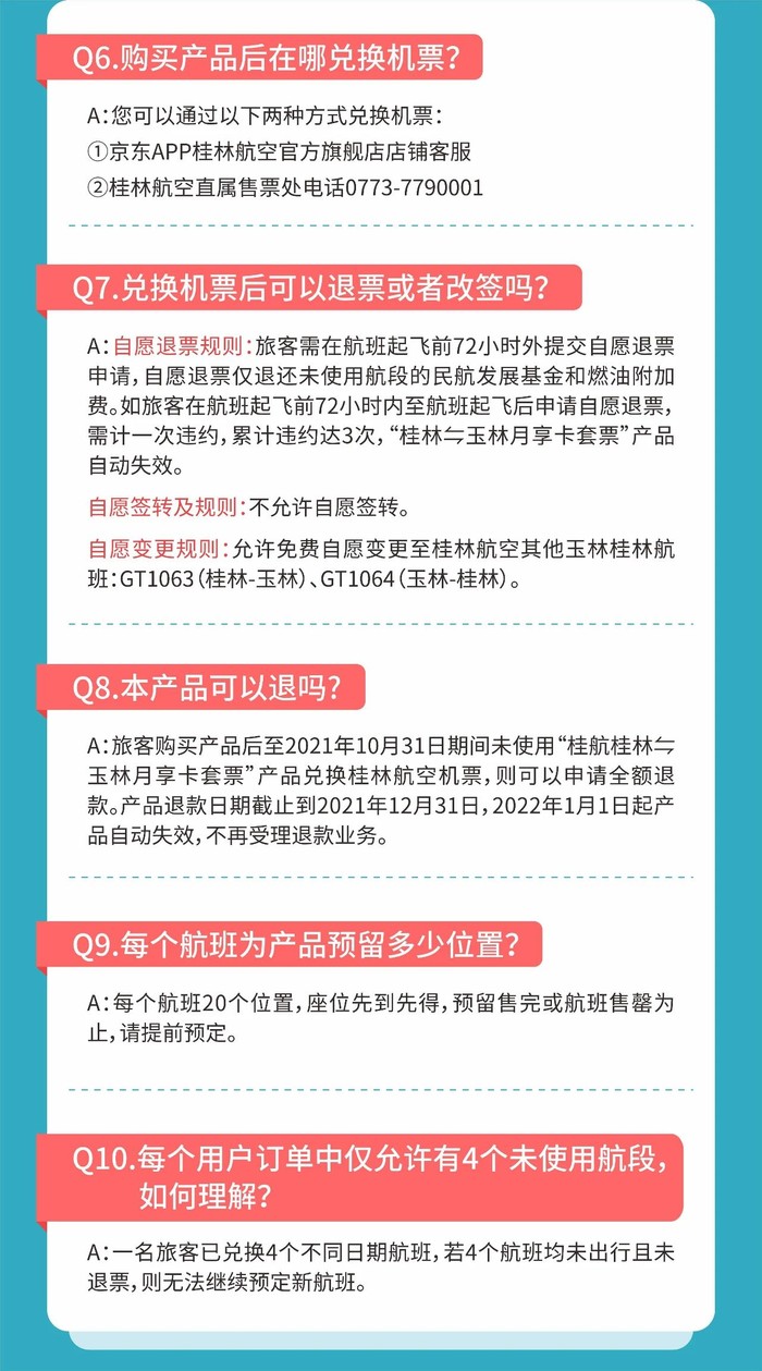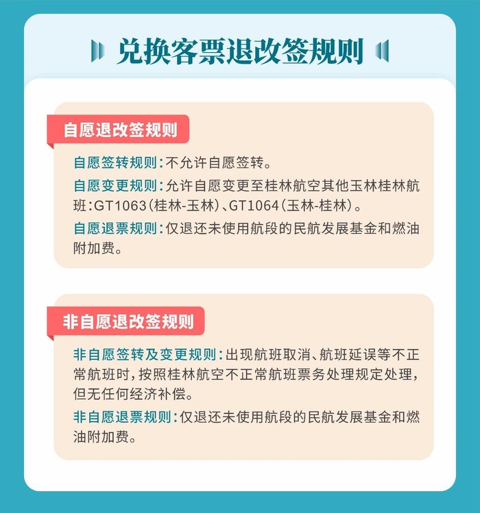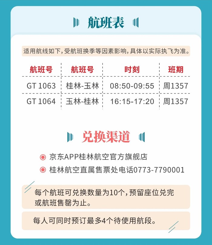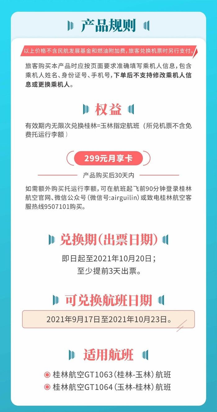 购买后有效期内,无限次兑换“桂林=玉林”或"玉林=桂林"航班!(每次飞行50元税费另给)