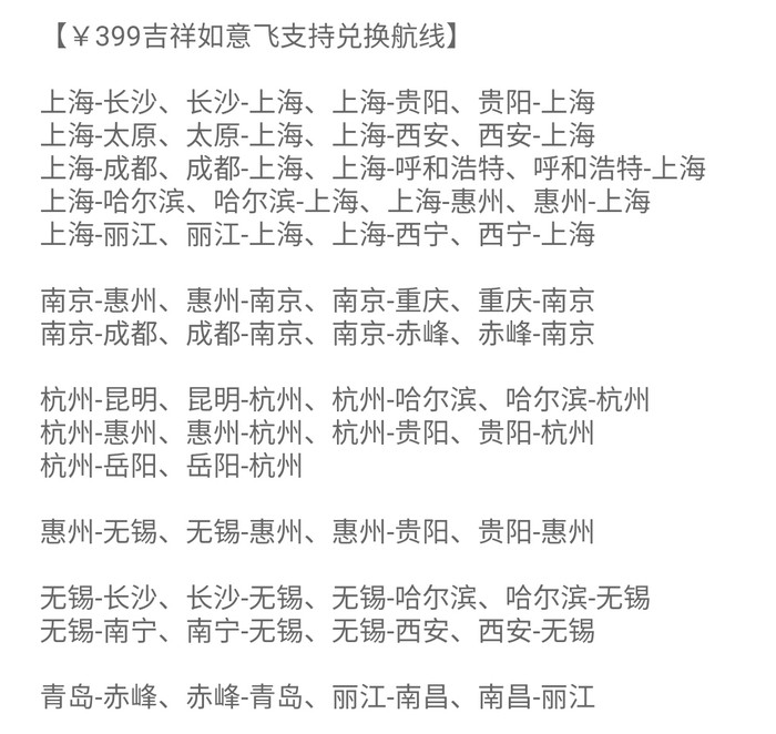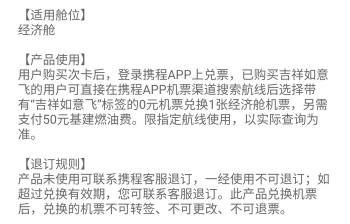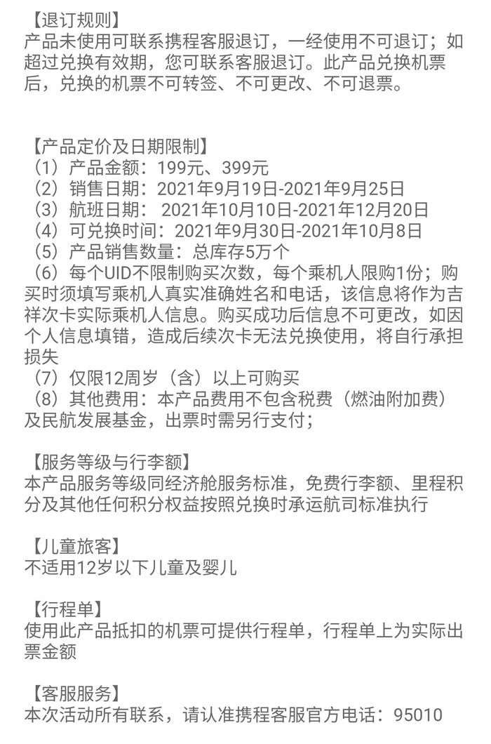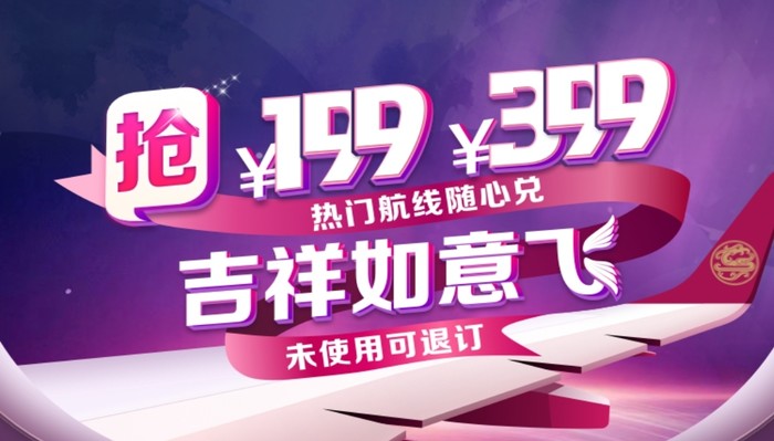 吉祥航空如意飞,价格199元/份、399元/份,购买之后,每份可以兑换吉祥航空机票1张。每个乘机人限购1份,机票税费另付,含行李托运,未使用可退订。