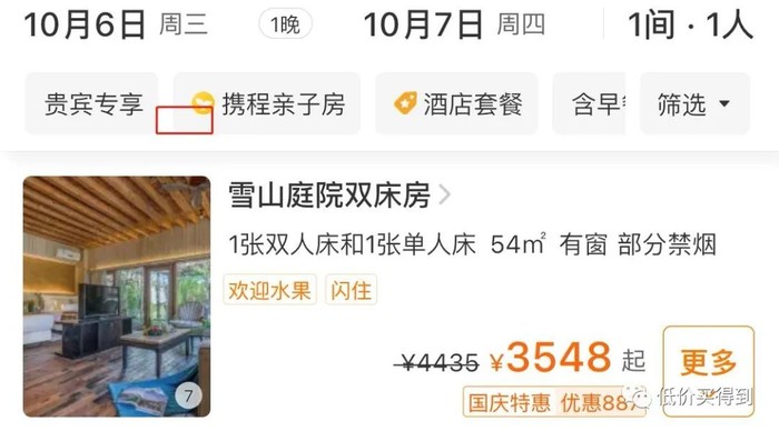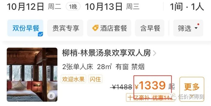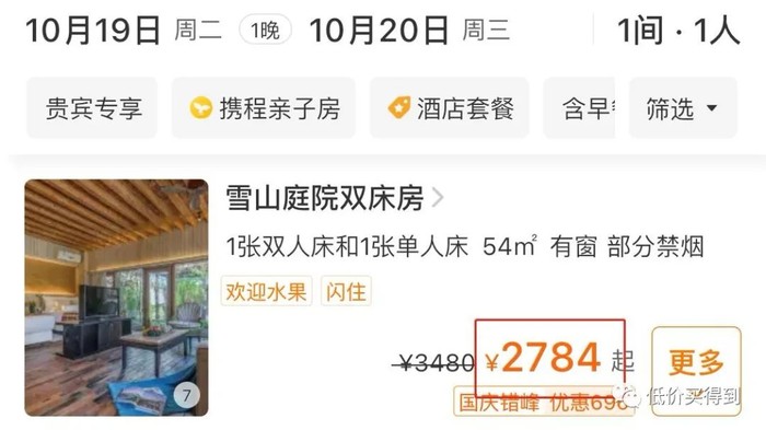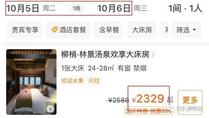 国庆期间预订一晚需2329元,套餐一晚加价后1488元,便宜了841元!