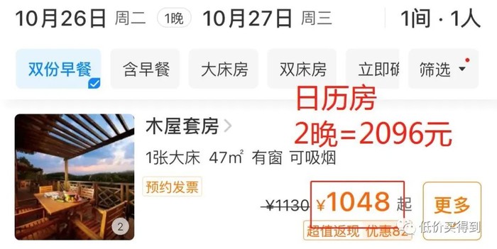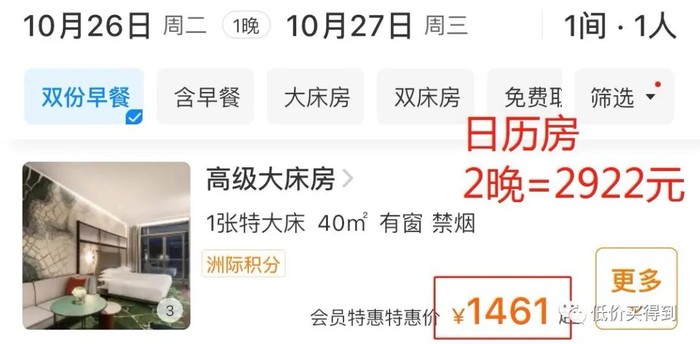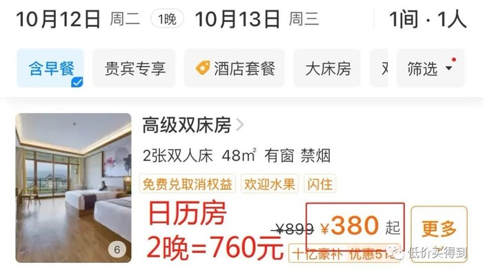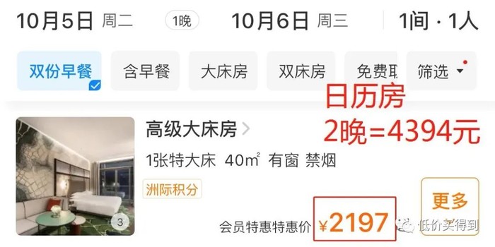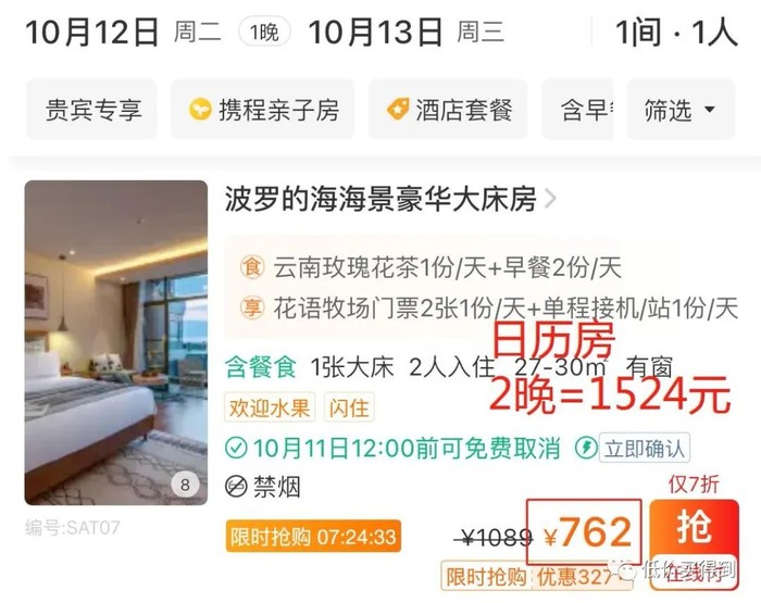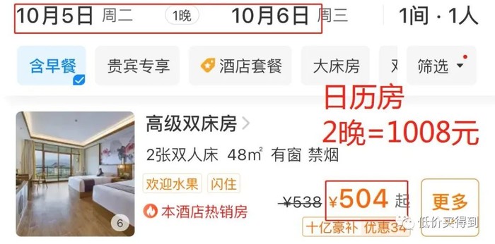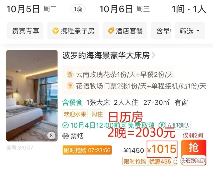 至于国庆节,订日历房2晚需4394元,但是套餐加价后也才3388元,便宜了1006元,打了7.7折,比平时更划算了!