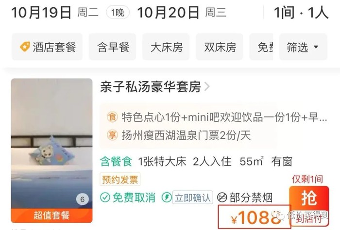 平时预订一晚含早需1088元,套餐一晚仅799元,便宜了289元,打了7.3折!套餐是有包含瘦西湖门票的。