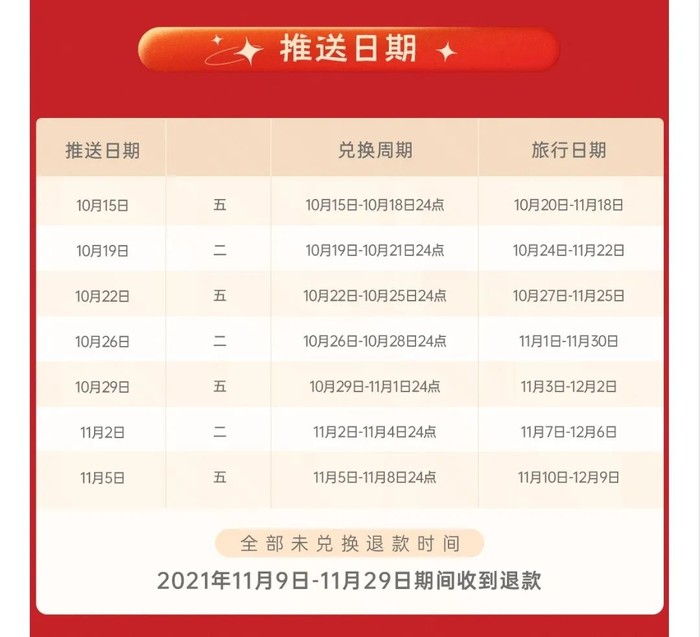 从10.15起,每周五、周二更新目的地,对应可选的旅行日期范围如下: